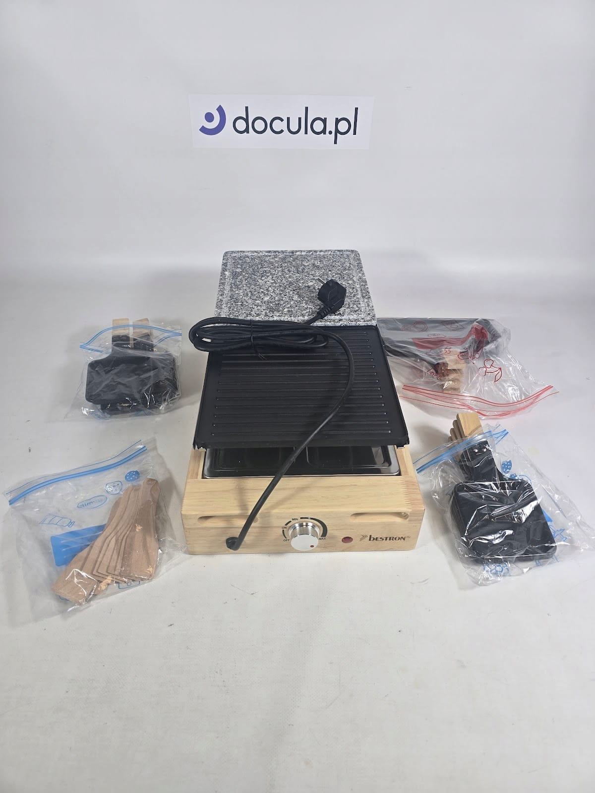- Zakres dostawy: 1 grill Bestron XL raclette, łącznie z 4 podwójnymi patelniami, 8 pojedynczymi patelniami i 8 drewnianymi skrobakami, czarnymi i drewnianymi, moc: 1500 W, wymiary: 61 x 21 x 32 cm, waga: 8 kg, materiał: żeliwo/tworzywo sztuczne/drewno, kolor: czarny/drewno, ARG300BW