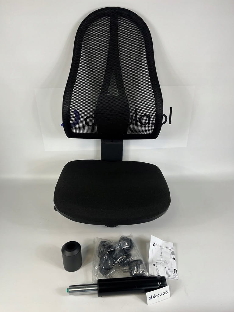 - Oparcie z siatkową osłoną w kolorze czarnym (100% poliester), siedzisko w czarnej osłonie z tkaniny (100% polipropylen)