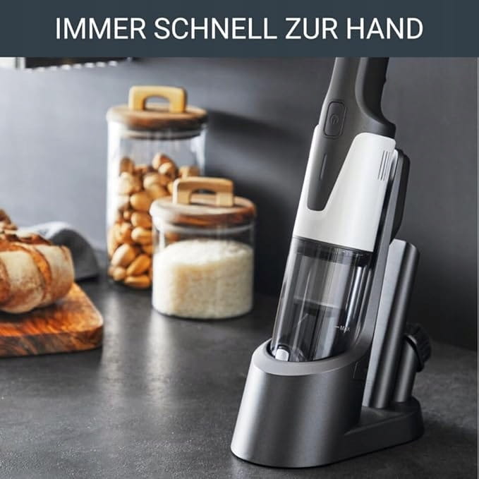 - Praktyczne funkcje: diody LED pokazujące stan baterii, łatwa obsługa jednym przyciskiem, przezroczysty pojemnik na kurz o pojemności 0,2 l, dodatkowe przyłącze ładowania na górze uchwytu i niezawodna wydajność akumulatora