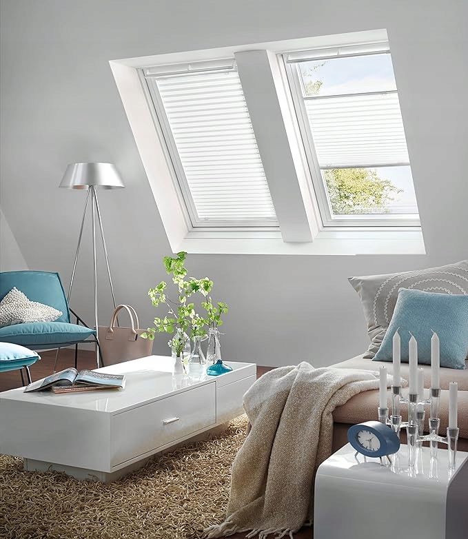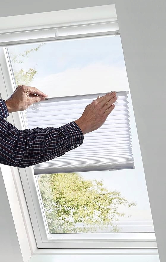 - Stylowa roleta plisowana do wszystkich powszechnie stosowanych okien dachowych, mocowanie w dowolnym miejscu na oknie, przepuszczająca światło, ale nieprzejrzysta ochrona przed wzrokiem i słońcem, montaż bez użycia narzędzi bez wiercenia i wkręcania dzięki 4 przyssawkom