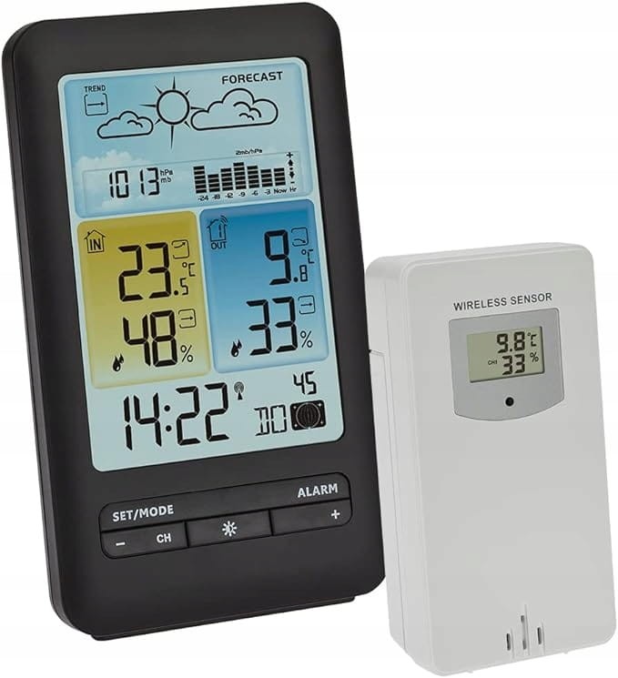 - Stacja pogodowa radiowa z prognozą pogody z symbolami pogody (słonecznie, częściowo zachmurzenie, pokryta, deszczowa, silny deszcz, śnieg) oraz ciśnienie powietrza i ciśnienie powietrza na 24 h, prognoza pogody opiera się na ciśnieniu powietrza i działa przez okres do 12 godzin