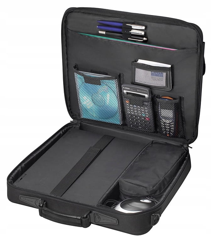Specjalne przegrody pozwalają w prosty i szybki sposób zorganizować przedmioty, m.in. płyty CD/DVD, długopisy, wizytówki i inne rzeczy. Wygodna rączka oraz odpinany pasek na ramię zapewniają odpowiedni komfort podczas przenoszenia torby. Rodzaj zapięcia: zamek. Kolor czarny.
